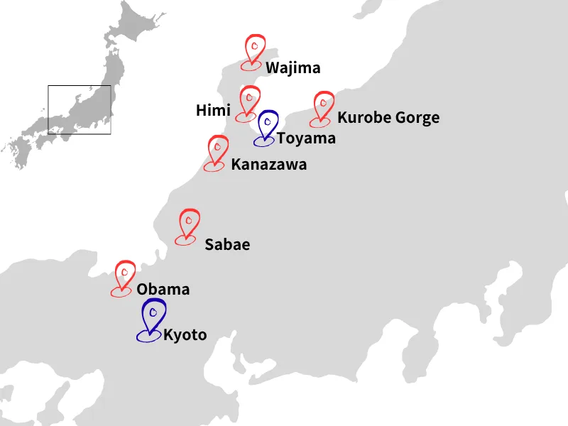 Miyama / Obama / Sabae / Tojinbo / Kanazawa / Wajima / Himi / Gokayma / Takaoka / Toyama / Kurobe Gorge / Toyama