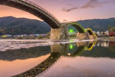 It spans the banks of the Nishiki River in a series of five wooden arches and it looks out at the foot of Mount Yokoyama. On this mountain, you can see the Iwakuni Castle on its summit. This bridge was originally a connection to the main gate of Iwakuni Castle.