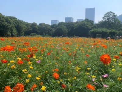 - Cosmos; late August-early October. These are the most colorful blooms in Japanese autumn, coming in pink, purple, red, orange, and white. A good place to see cosmos flowers in Japan is the Hamarikyu Gardens but if you really want to see them in their full glory with Mt. Fuji in the background you have to head to Hana no Miyako Park near Lake Yamanaka.
