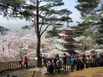 I visited Arakurayama Sengen Park on April 1st, 2021. It was a sunny day, so I was very excited in the morning when I left home before 7 am. I took the express train Fuji-Kaiyu, which only took one hour and 40 minutes. When I arrived at Shimoyoshida Station, it was already getting more cloudy. But, the cherry blossoms on the way were in full bloom, as they were blooming early this year.